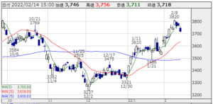 ★株価推移:3,237円〜3,820円(21/10/1〜22/2/16)