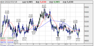 | 安値 | 5,030円 | 高値 | 5,070円 | 終値 | 5,050円(+20円) |