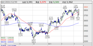 株価推移:3,237円〜3,838円(21/10/1〜22/3/10)