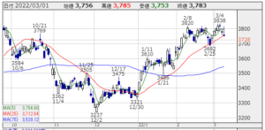 ★株価推移:3,237円〜3,838円(21/10/1〜22/3/8)