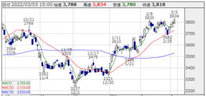 ★株価推移:3,237円〜3,834円(21/10/1〜22/3/3)