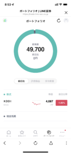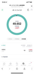 3/25よりLINE証券で資産運用してます。LINE証券は、単元未満株を即時約定で購入できますが、KDDI株は、売り買いに0.02%の手数料がかかりますのでその分を差し引いた分での利確をすることが重要になります。銘柄はいつも株価情報を出している 9433KDDI で運用します。日々の株価情報を記載するための基礎情報にもなると考えました。