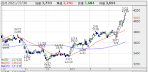 ★株価推移:3,237円〜4,169円(21/10/1〜22/3/24) !!年高・4,169円・上場来最高値!!