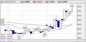 ★株価推移:4,870円〜5,190円(22/4/1〜22/5/23) (一株配当:172円,配当利回り:3.327%)高値:5,190円