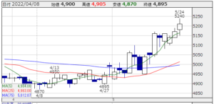 ★株価推移:4,870円〜5,240円(22/4/1〜22/5/24) (一株配172円,配当利回り:3.301%)高値:5,240円