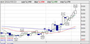 ★株価推移:4,870円〜5,280円(22/4/1〜22/5/30) (一株配172円,配当利回り:3.289%)高値:5,280円