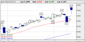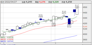 ★株価推移:3,981円〜4,485円(22/4/1〜22/5/17) 上場来最高値:4,485円(一株配当:135円,配当利回り:3.012%)