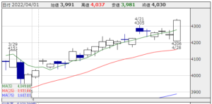 ★株価推移:3,981円〜4,344円(22/4/1〜22/4/28)