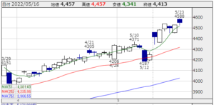 ★株価推移:3,981円〜4,606円(22/4/1〜22/5/26) (一株配当:135円,配当利回り:2.931%) 上場来高値:4,606円