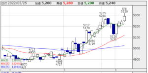 | 安値 | 5,240円 | 高値 | 5,320円 | 終値 | 5,290円(+50円) |