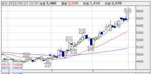 | 安値 | 5,450円 | 高値 | 5,570円 | 終値 | 5,570円(+90円) |