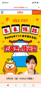 「au PAY」でPontaポイントが必ず当たる「たぬきの抽選会」、毎月5のつく日と8日に