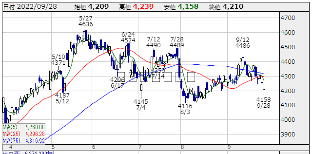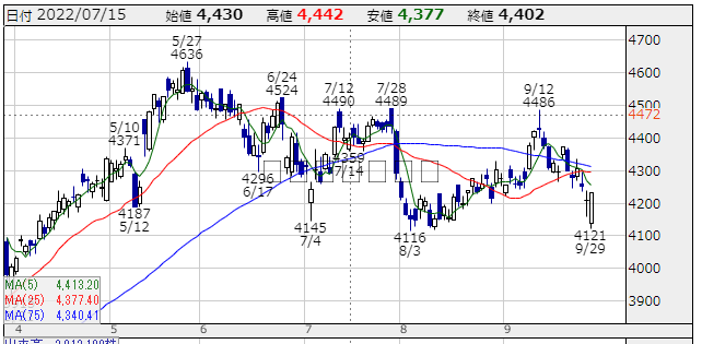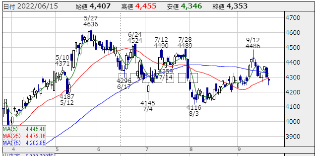 ★株価推移:3,981円〜4,606円(22/4/1〜22/9/28) (一株配当:135円,配当利回り:3.191%) 上場来高値:4,636円