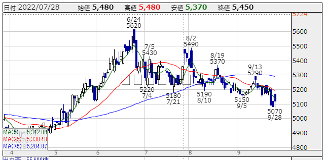 ★株価推移:4,870円〜5,420円22/4/1〜22/9/28) (一株配172円,配当利回り:3.359%)上場来最高値:5,620円