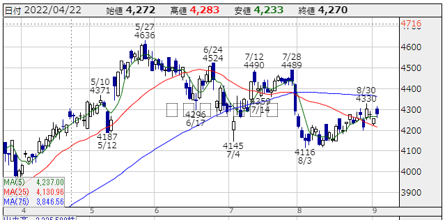 ★株価推移:3,981円〜4,606円(22/4/1〜22/9/6) (一株配当:135円,配当利回り:3.173%) 上場来高値:4,636円