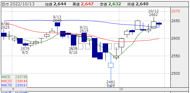 安値 2,632円 高値 2,647円 終値 2,640円(-7円)