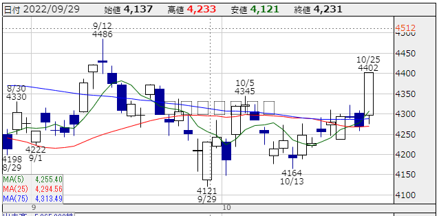 ★株価推移:3,981円〜4,606円(22/4/1〜22/10/25) (一株配当:135円,配当利回り:3.067%) 上場来高値:4,636円