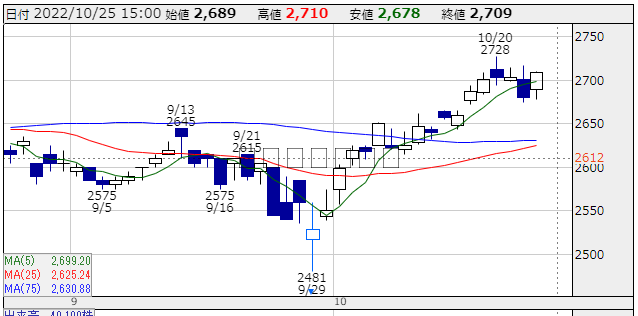 ★株価推移:2,435円〜2,710円22/4/1〜22/10/25) (一株配86円,配当利回り:3.175%)上場来最高値:2,810円