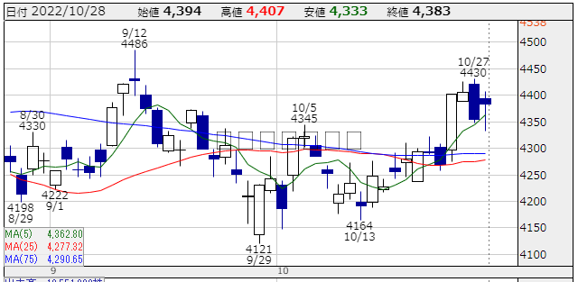 株価推移:3,981円〜4,606円(22/4/1〜22/10/28) (一株配当:135円,配当利回り:3.080%) 上場来高値:4,636円