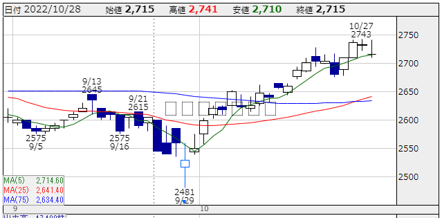 安値 2,715円 高値 2,741円 終値 2,715円(-18円)