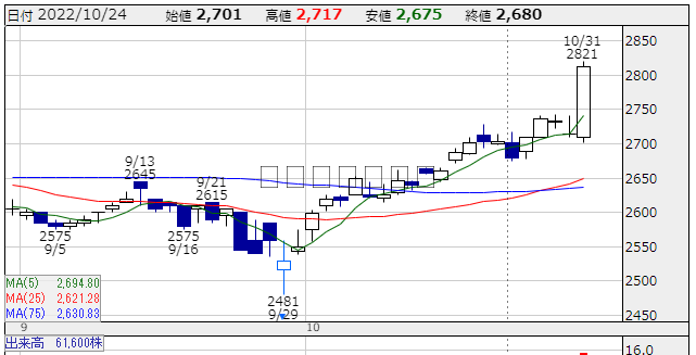 ★株価推移:2,435円〜2,710円22/4/1〜22/10/31) (一株配86円,配当利回り:3.057%)上場来最高値:2,821円