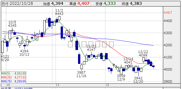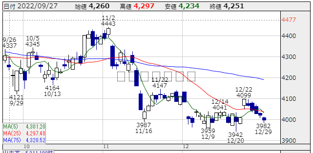 ★株価推移:3,942円〜4,443円(22/10/1〜22/12/29) (一株配当:135円,配当利回り:3.378%) 上場来高値:4,636円