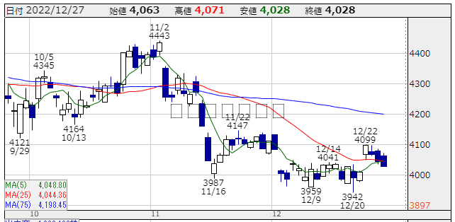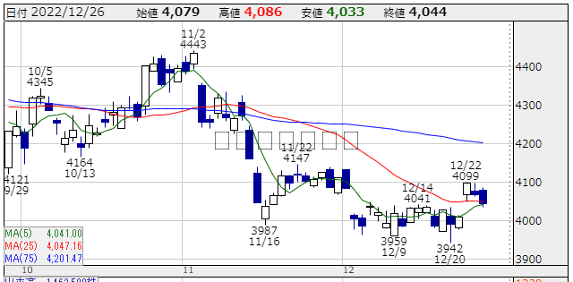 ★株価推移:3,942円〜4,443円(22/10/1〜22/12/27) (一株配当:135円,配当利回り:3.352%) 上場来高値:4,636円