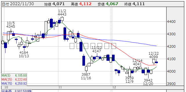★株価推移:3,981円〜4,606円(22/4/1〜22/12/23) (一株配当:135円,配当利回り:3.320%) 上場来高値:4,636円