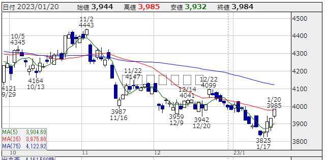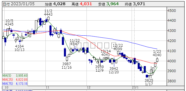 ★株価推移:3,942円〜4,443円(22/10/1〜23/1/24) (一株配当:135円,配当利回り:3.293%) 上場来高値:4,636円