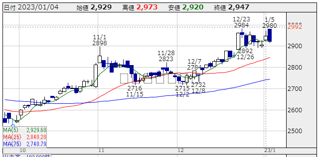 安値 2,980円 高値 2,980円 終値 2,923円(-24円)
