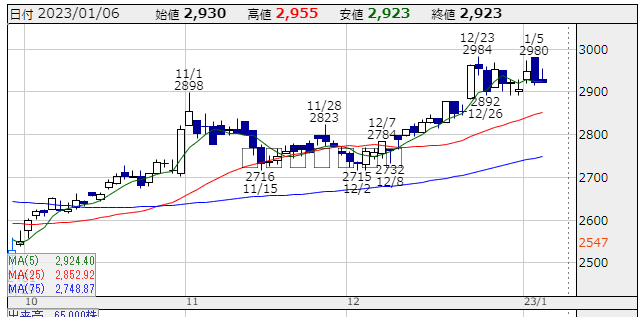 ★株価推移:2,557円〜2,984円22/10/1〜23/1/6) (一株配86円,配当利回り:2.942%)上場来最高値:2,984円