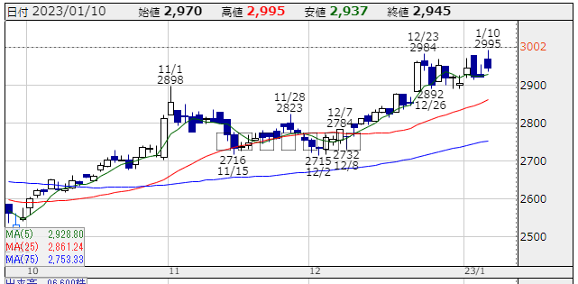 安値 2,937円 高値 2,995円 終値 2,945円(+22円)