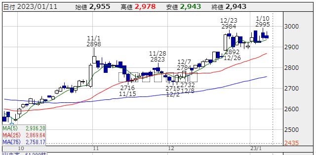 ★株価推移:2,557円〜2,995円22/10/1〜23/1/11) (一株配86円,配当利回り:2.922%)上場来最高値:2,995円