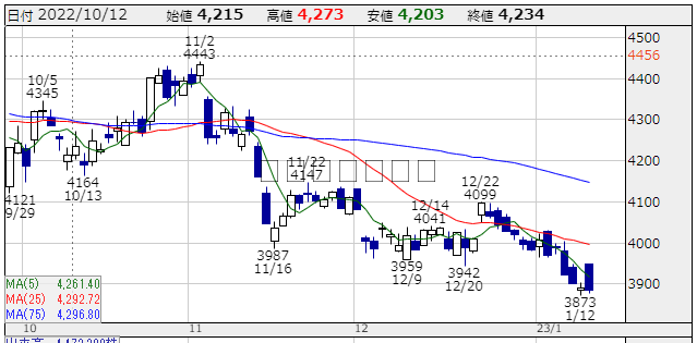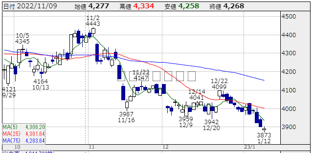 ★株価推移:3,942円〜4,443円(22/10/1〜23/1/16) (一株配当:135円,配当利回り:3.518%) 上場来高値:4,636円