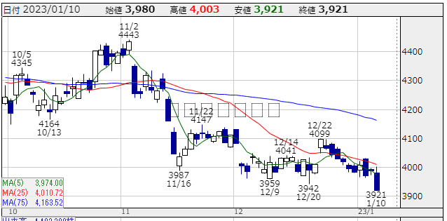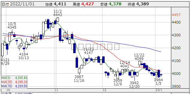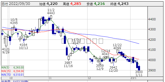 ★株価推移:3,942円〜4,443円(22/10/1〜23/1/11) (一株配当:135円,配当利回り:3.462%) 上場来高値:4,636円