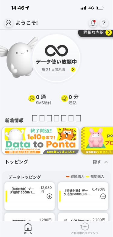 取り急ぎ、データ使い放題(24時間)を適用しました。