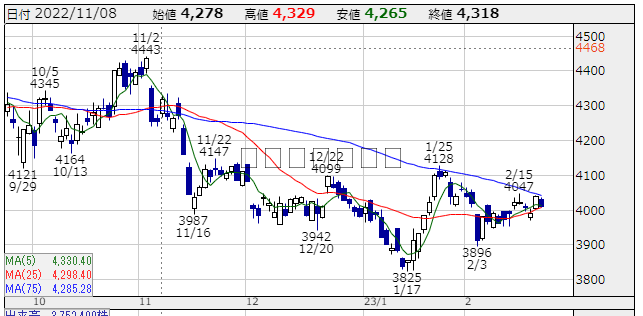 ★株価推移:3,942円〜4,443円(22/10/1〜23/2/21) (一株配当:135円,配当利回り:3.367%) 上場来高値:4,636円