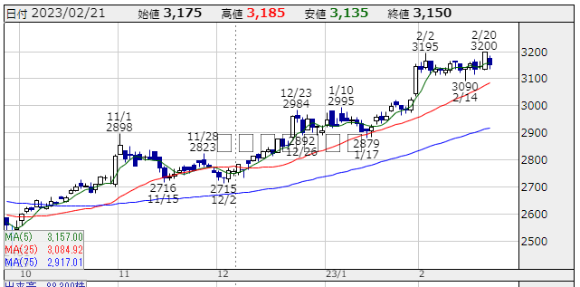 ★株価推移:2,557円〜3,200円22/10/1〜23/2/21) (一株配86円,配当利回り:2.730%)上場来最高値:3,200円