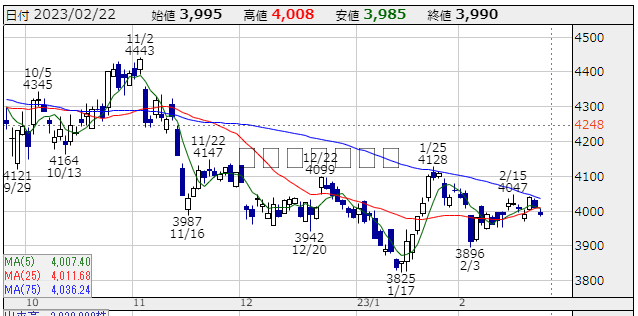 ★株価推移:3,942円〜4,443円(22/10/1〜23/2/22) (一株配当:135円,配当利回り:3.383%) 上場来高値:4,636円