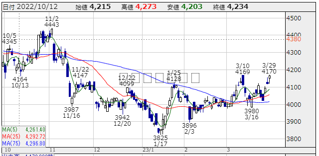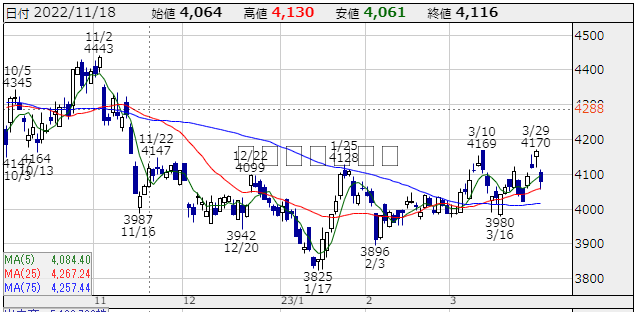★株価推移:3,942円〜4,443円(22/10/1〜23/3/30) (一株配当:135円,配当利回り:3.310%) 上場来高値:4,636円