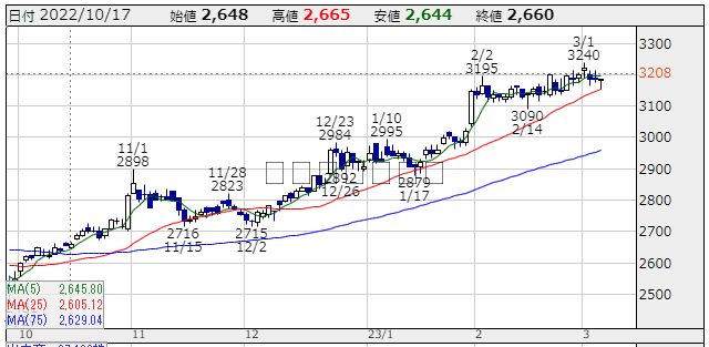 ★株価推移:2,557円〜3,240円22/10/1〜23/3/6) (一株配86円,配当利回り:2.700%)上場来最高値:3,240円