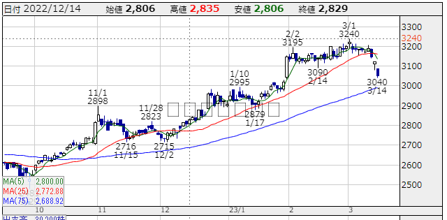 株価推移:2,557円〜3,240円22/10/1〜23/3/14) (一株配86円,配当利回り:2.820%)上場来最高値:3,240円