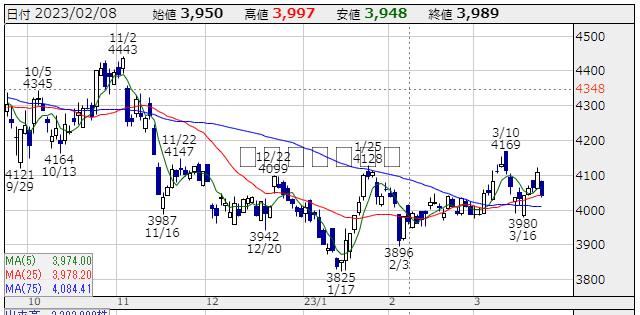 ★株価推移:3,942円〜4,443円(22/10/1〜23/3/23) (一株配当:135円,配当利回り:3.341%) 上場来高値:4,636円