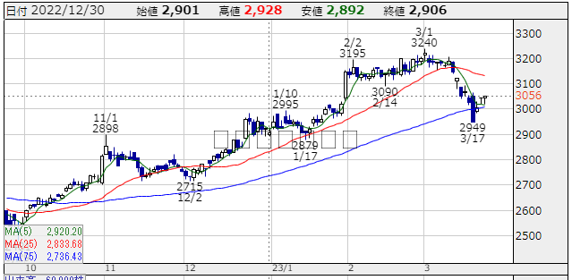 ★株価推移:2,557円〜3,240円22/10/1〜23/3/23) (一株配86円,配当利回り:2.820%)上場来最高値:3,240円