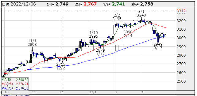 | 高値 | 3,055円 | 安値 | 3,030円 | 終値 | 3,045円(+25円) |