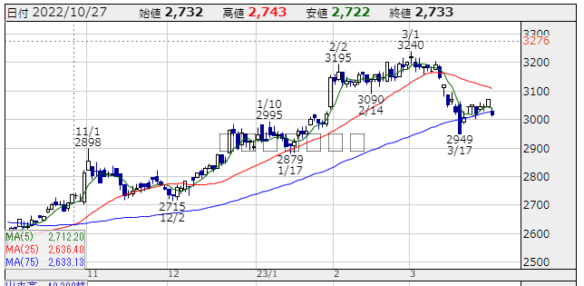 | 高値 | 3,040円 | 安値 | 3,010円 | 終値 | 3,015円(-55円) |