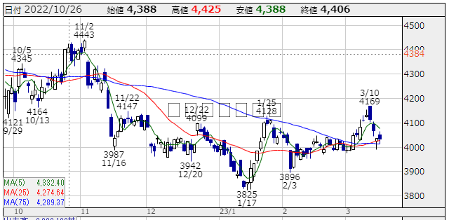 ★株価推移:3,942円〜4,443円(22/10/1〜23/3/15) (一株配当:135円,配当利回り:3.348%) 上場来高値:4,636円
