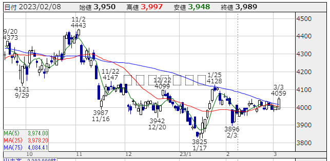 ★株価推移:3,942円〜4,443円(22/10/1〜23/3/3) (一株配当:135円,配当利回り:3.335%) 上場来高値:4,636円