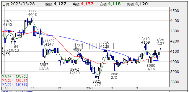 ★株価推移:3,942円〜4,443円(22/10/1〜23/3/28) (一株配当:135円,配当利回り:3.277%) 上場来高値:4,636円