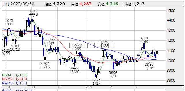 ★株価推移:3,942円〜4,443円(22/10/1〜23/3/27) (一株配当:135円,配当利回り:3.298%) 上場来高値:4,636円